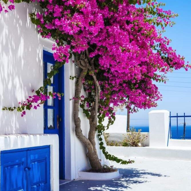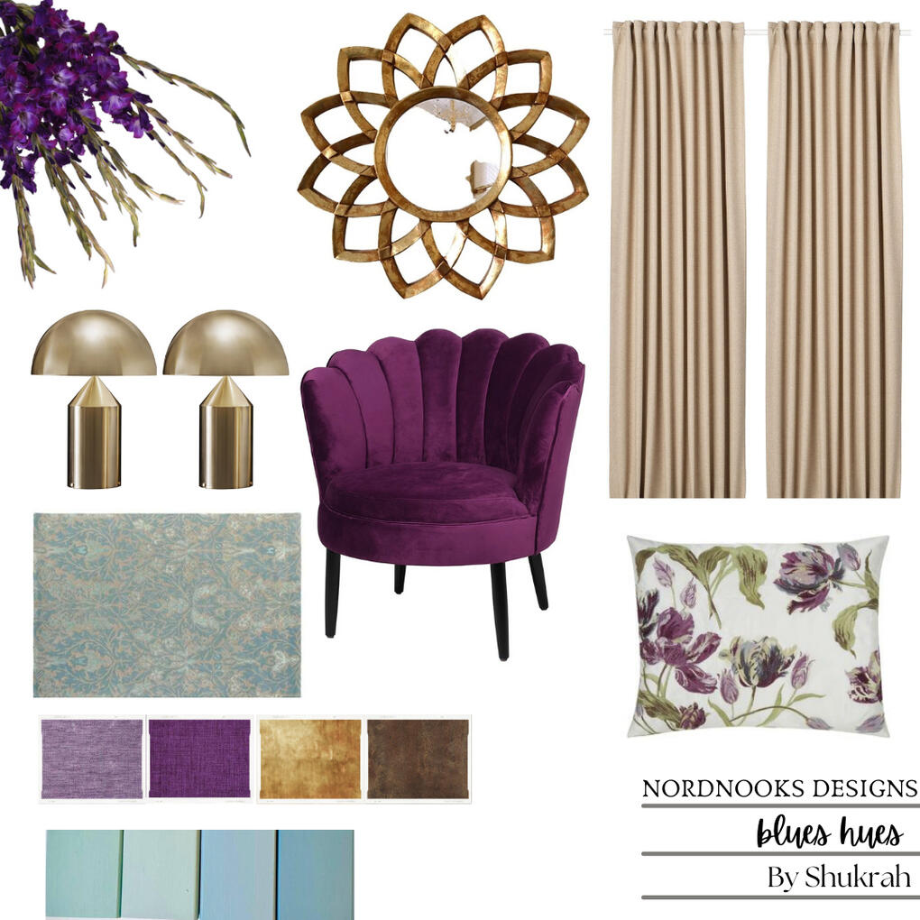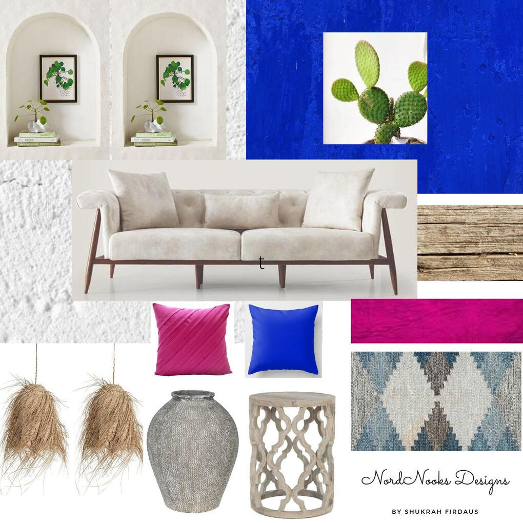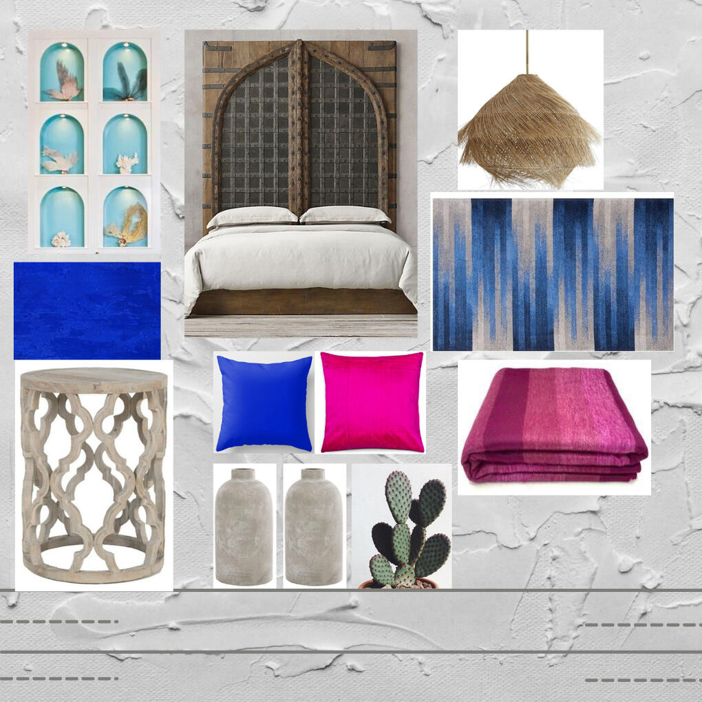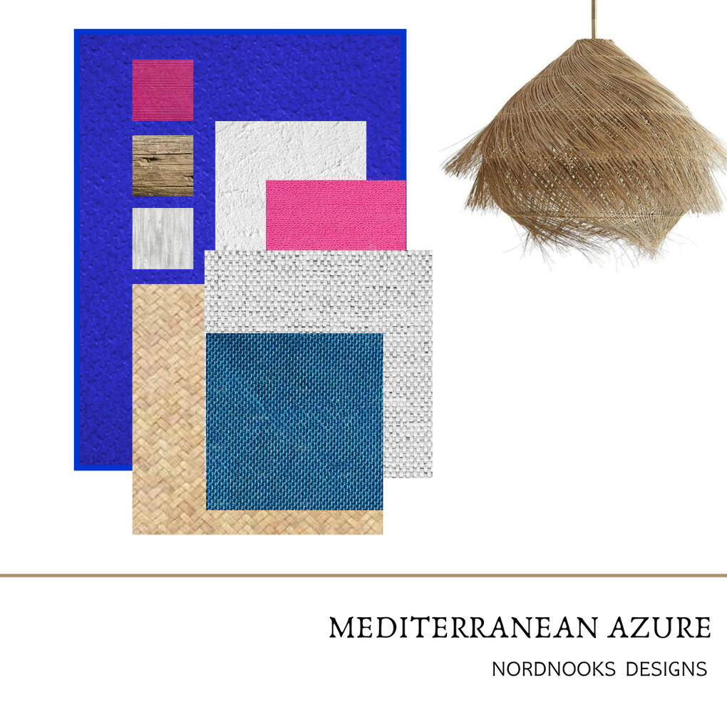 a palette inspired by the city of Mykonos a Greek island. A relaxed aesthetic with the perfect blend of azure,majorelle and bougenvillea pink. Elements like white washed walls and pops of blue and pink are used to create a refreshing and awakening palette.